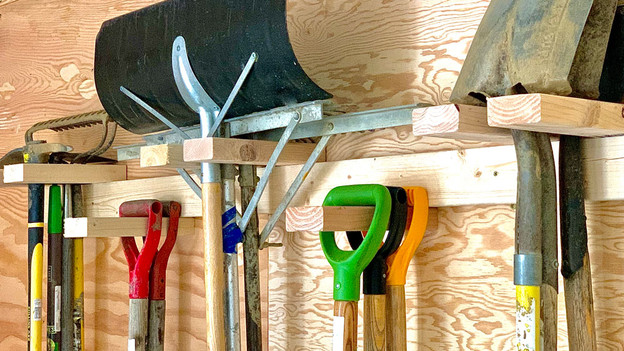 Pás, vassouras e rastelos também são considerados ferramentas e normalmente são deixados encostados em algum canto da oficina. Que tal organizar esses itens também? Você pode criar uma prateleira simples com pequenos espaços para encaixar cada uma dessas ferramentas. Uma solução simples e prática!